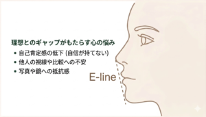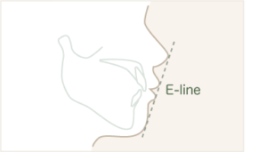 第1弾の記事でも触れましたが、横顔の美的指標として広く使われているEライン(エステティックライン)は、鼻先とオトガイ(あご先)を結んだ仮想線です。一般的に、上下の口唇がこのEラインよりやや内側に収まる状態が、横顔のバランスとして評価されやすいと考えられています。