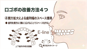 側方拡大は、歯列の幅を左右方向に広げてスペースを確保する方法です。歯列が狭く、前歯が窮屈に並んでいるために前方へ押し出されているケースで有効となる場合があります。